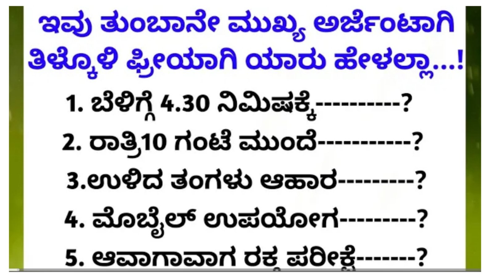 * ರಾತ್ರಿ ಹೊತ್ತು ತುಂಬಾ ತಡವಾಗಿ ಮಲಗಿಕೊಳ್ಳುವುದು ಆರೋಗ್ಯಕ್ಕೆ ತುಂಬಾ ಅಪಾಯ.