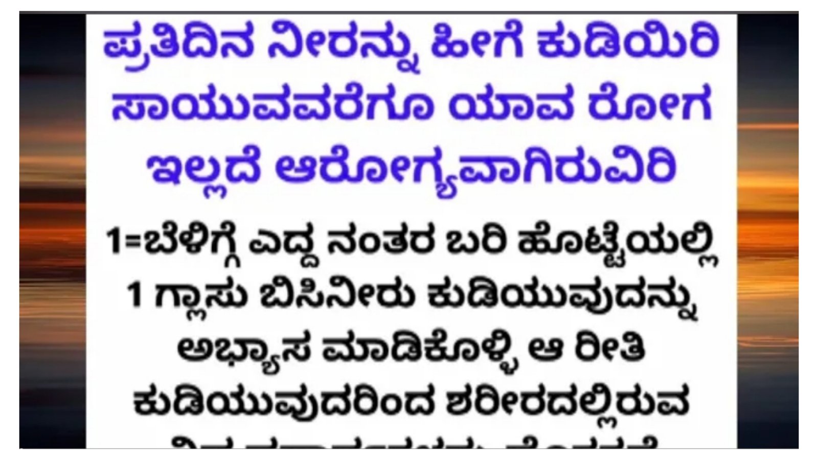 * ಗಮನಿಸಿ ಯಾವಾಗಲೂ ನೀರನ್ನು ಕುಳಿತುಕೊಂಡೆ ಕುಡಿಯಬೇಕು ಜೊತೆಗೆ ಗಟಗಟ ಅಂತ ಕುಡಿಯಬಾರದು ಸಿಪ್ ಮಾಡಿಕೊಂಡು ಕುಡಿಯುವುದು ಆರೋಗ್ಯಕ್ಕೆ ಉತ್ತಮ ಒಬ್ಬ ಮನುಷ್ಯ ಪ್ರತಿದಿನ 2-3 ಲೀಟರ್ ನೀರು ಕುಡಿಯಬೇಕು ಅದಕ್ಕಿಂತ ಜಾಸ್ತಿ ಕುಡಿದರು ಕೂಡ ಇನ್ನೂ ಒಳ್ಳೆಯದೇ ಆದರೆ ಕಡಿಮೆ ಮಾಡಬೇಡಿ. ಪ್ರತ್ಯೇಕವಾಗಿ ಬೇಸಗೆ ಕಾಲದಲ್ಲಿ ನೀರು ಕಡಿಮೆ ಕುಡಿಯುವುದರಿಂದ ಮೂತ್ರ ಉರಿ ಬರುವ ಸಾಧ್ಯತೆ ಹೆಚ್ಚು.